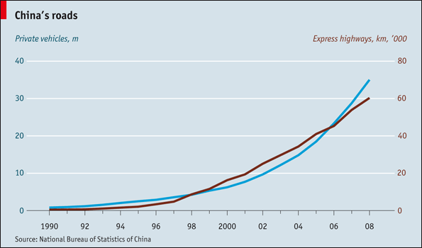 Esta gráfica es ejemplar del problema de los automóviles y el tráfico en China. Este país recientemente se ha convertido en el mercado más grande del mundo de automóviles, y su crecimiento económico hace que millones de personas puedan acceder a ellos. Esto ha generado muchos problemas de tráfico y la solución que China ha emprendido en primer lugar ha sido construir más vías rápidas, no obstante no se ha solucionado el problema y ha aumentado; como el ejemplo de un embotellamiento de 100 km en Beijing, por el cual se ha bautizado a esta ciudad como el estacionamiento más grande del mundo. Por ello este país asiático ha emprendido una nueve canasta de medias para reducir el congestionamiento vehícular, incluyendo limitar licencias y más calles. Mis perspectivas de que puedan resolver el problema son un tanto pesimistas mientras se enfoquen a producir más automóviles (para todo el mundo) y en hacer más calles para los mismos.