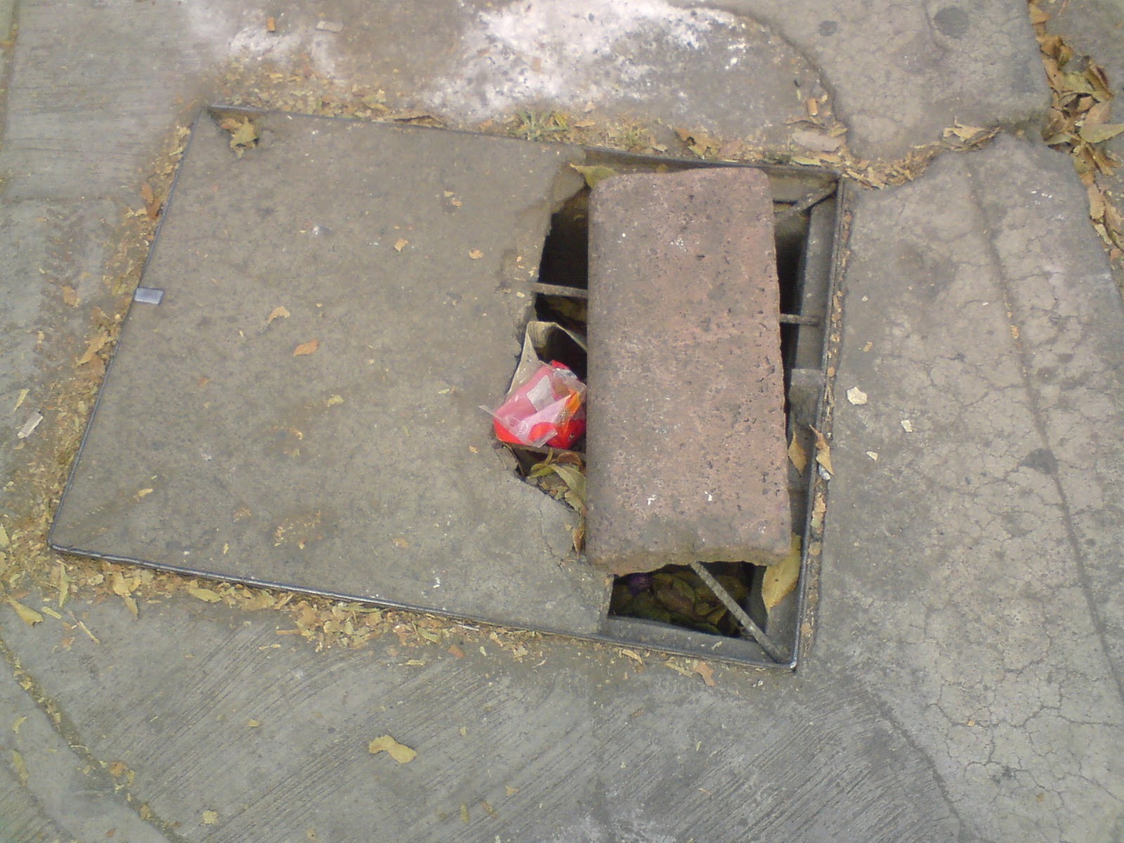 Tapa de red de servicios subterránea en mal estado. Vi a alguien tropezar con ella.