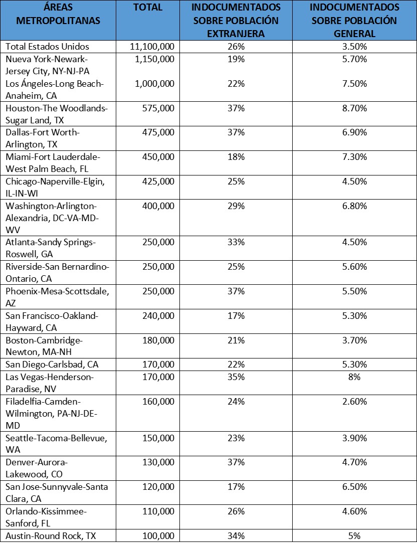 Tabla 1: Población indocumentada por área metropolitana en EUA