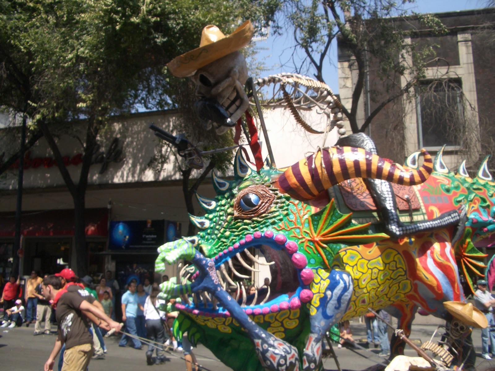 Pensé en ir al Zombie Walk 2010 DF y me encontré a unos amigos en la «Noche de los Alebrijes» 2010. Llevaban una pieza y me les uní en su trayecto por Reforma. Fue de lo más divertido, entre la banda norteña que triamos delante, los arlequines, luchadores, el desfile, los mismos alebrijes, el ambiente de fiesta de la gente al paso de cada pieza y cosas sorprendentes como los chinelos que aparecieron bailando al ritmo de una de las bandas. Francamente las tradiciones y el folclor de México me parecen grandiosos…y los zombies, no tanto.