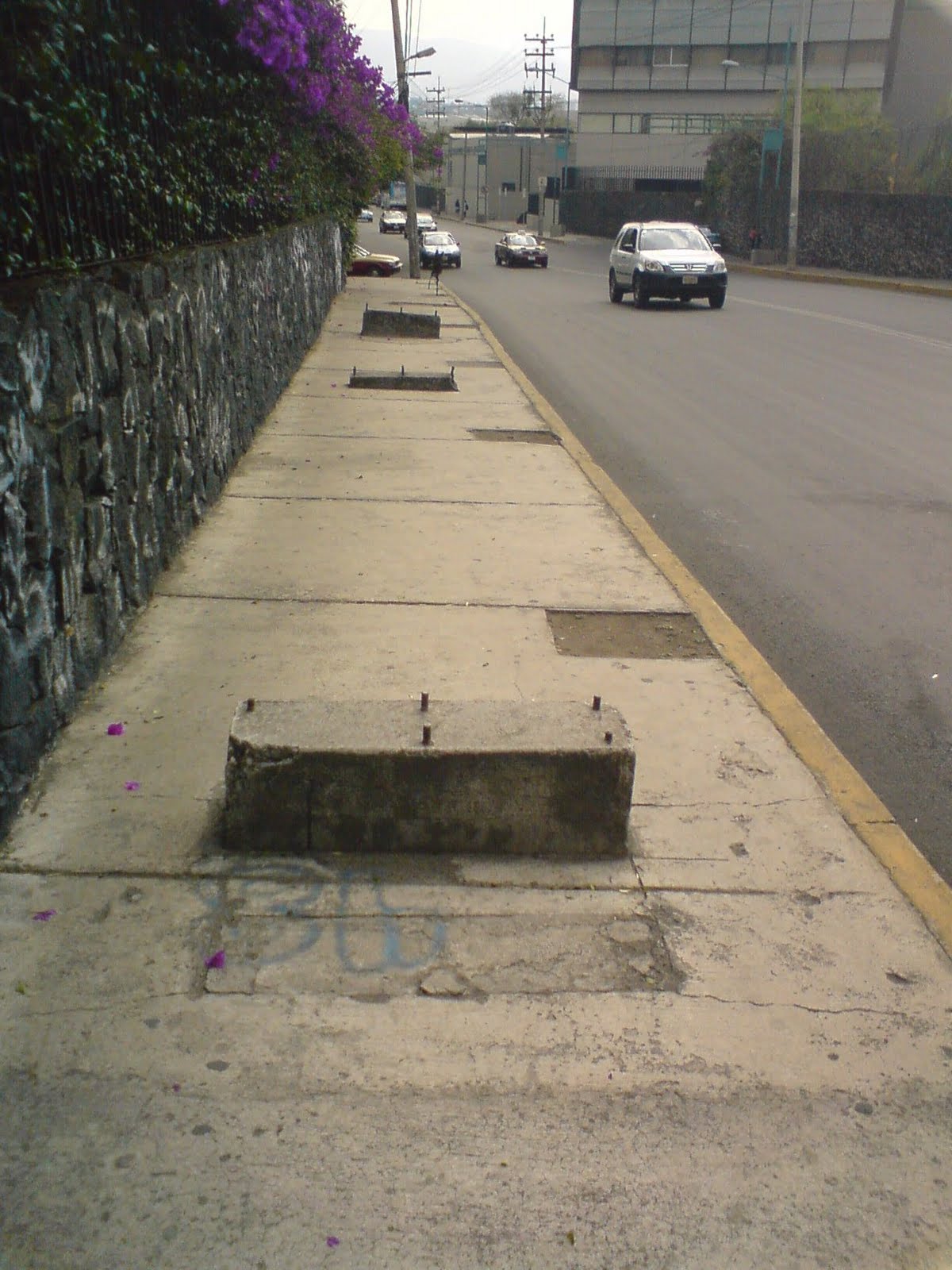 Notese la rampa en una sola acera, además de que sólo se podría ascender a la banqueta en ella si tiene una silla de ruedas que se desplace paralelamente.