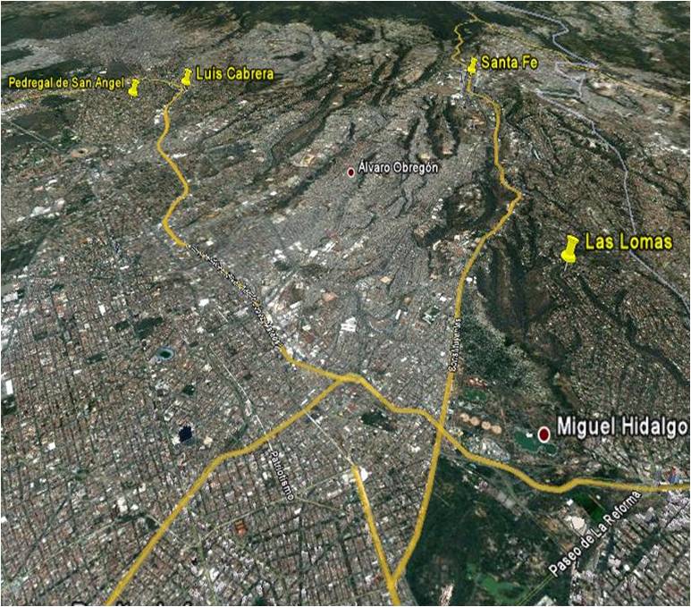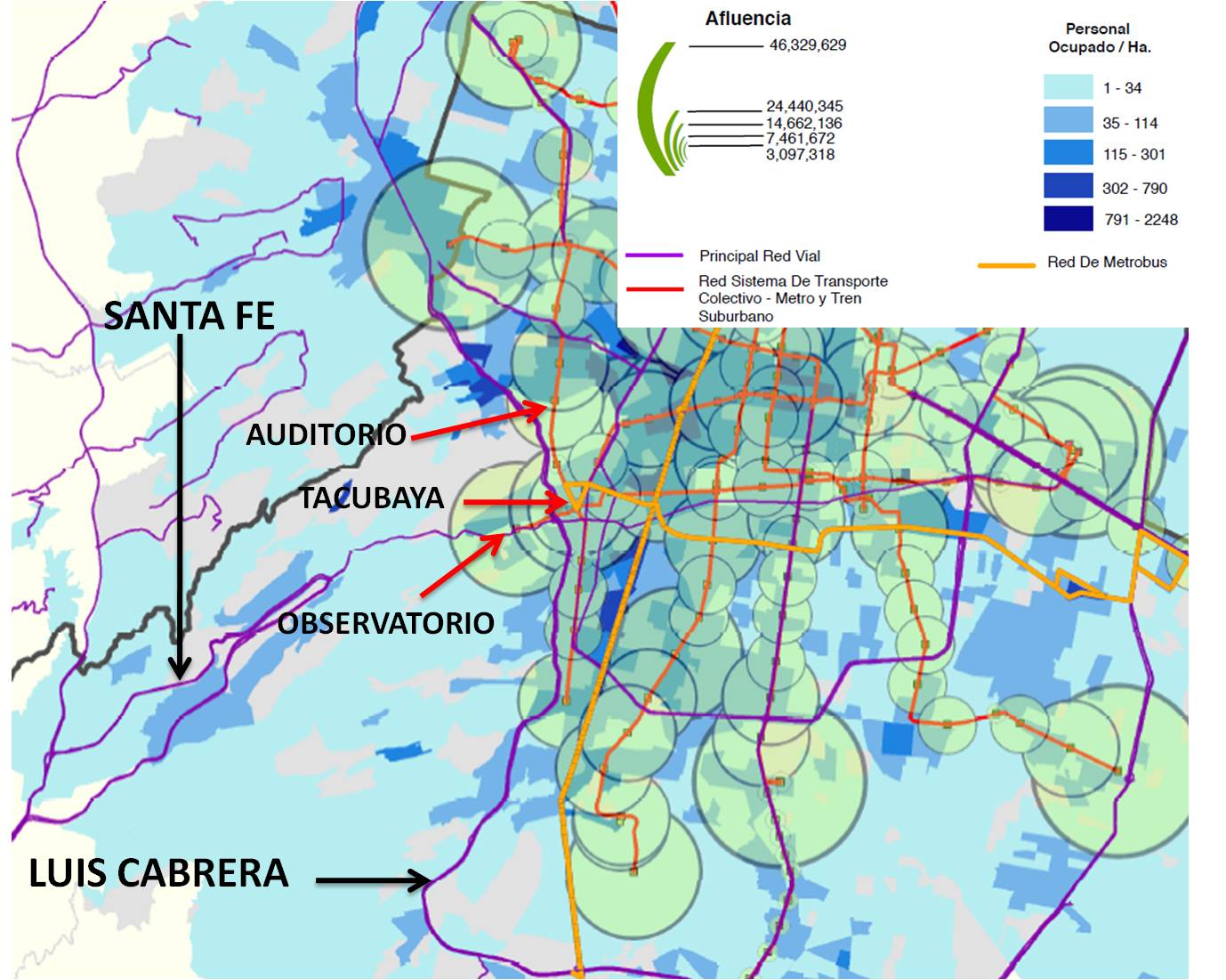 Igualmente, Santa Fe se encuentra alejado de la columna vertebral del sistema de transporte público de la Ciudad de México, que es el metro. La mayor parte de las rutas de transporte público que comunican Santa Fe y alrededores desembocan en la CETRAM Observatorio, CETRAM Tacubaya y metro Auditorio. Si se observa la segunda ilustración, es posible apreciar que la afluencia de pasajeros es muy importante en estos puntos, señalados como receptores del flujo que se trasladan por Reforma, Constituyentes y Viejo Camino a Santa Fe, rutas principales para acceder a Santa Fe (punto de mayor personal ocupado en el poniente). Cabe destacar, que el transporte público por estas vías no es muy eficiente en tiempo, ya que compite con el vehículo particular por la superficie de rodamiento (calles).