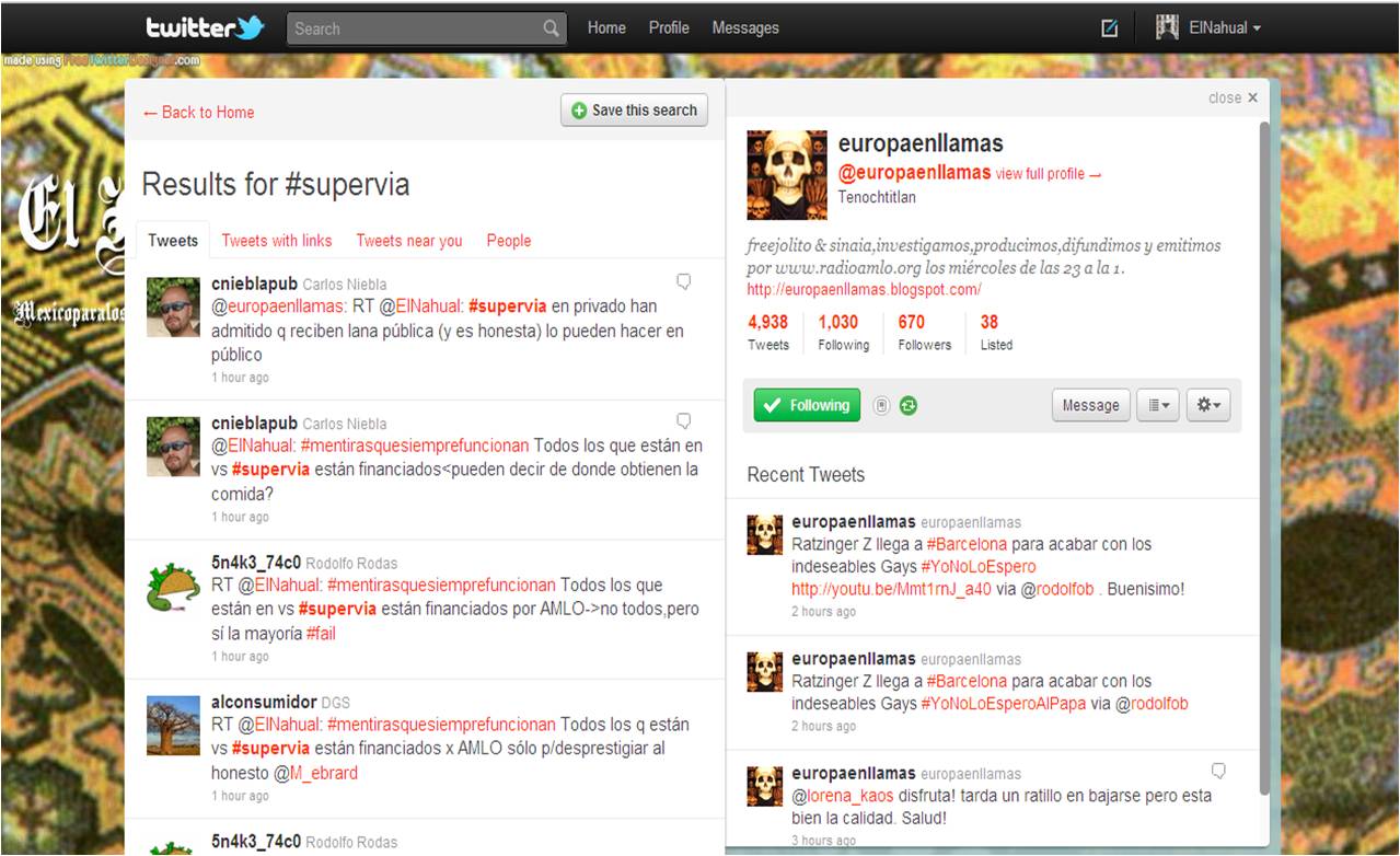 Tenemos información de que el Gobierno del D.F. o las empresas que tienen la concesión de la Supervía contrataron a una agencia de comunicación http://www.zimat.com/ para manejar esto. Últimamente este tipo de agencias de relaciones públicas están "innovando" con comunicación por medio de las redes sociales. Sin embargo, yo creo que sus ejecutivos son poco sofisticados en el uso de estas redes y no son lo suficientemente profesionales para entender bien los argumentos y debatirlos y usar efectivamente estas redes. Tal vez, soy ingenua y su estrategia del desprestigio y la descalificación "light" (por argumento políticos, que me parece lo más chafa aún) tiene un sentido de comunicación más profundo que llego a ignorar.