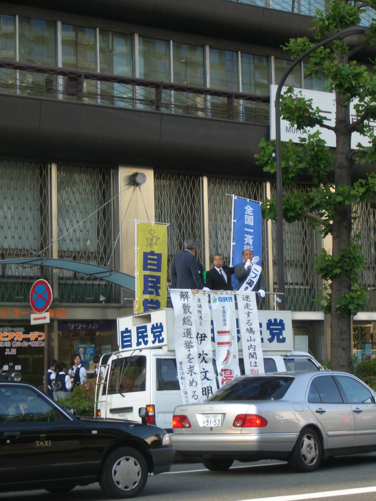 Una curiosidad que me encontré en Kyoto fue a estos políticos de oposición al partido gobernante de Japón que pedían la disolución del parlamento japonés y la convocatoria elecciones generales. (Según me explicaron). Es curiosa la protesta, con un coche de campaña, guantes blancos, la banda en el pecho y saludando a todo el público.